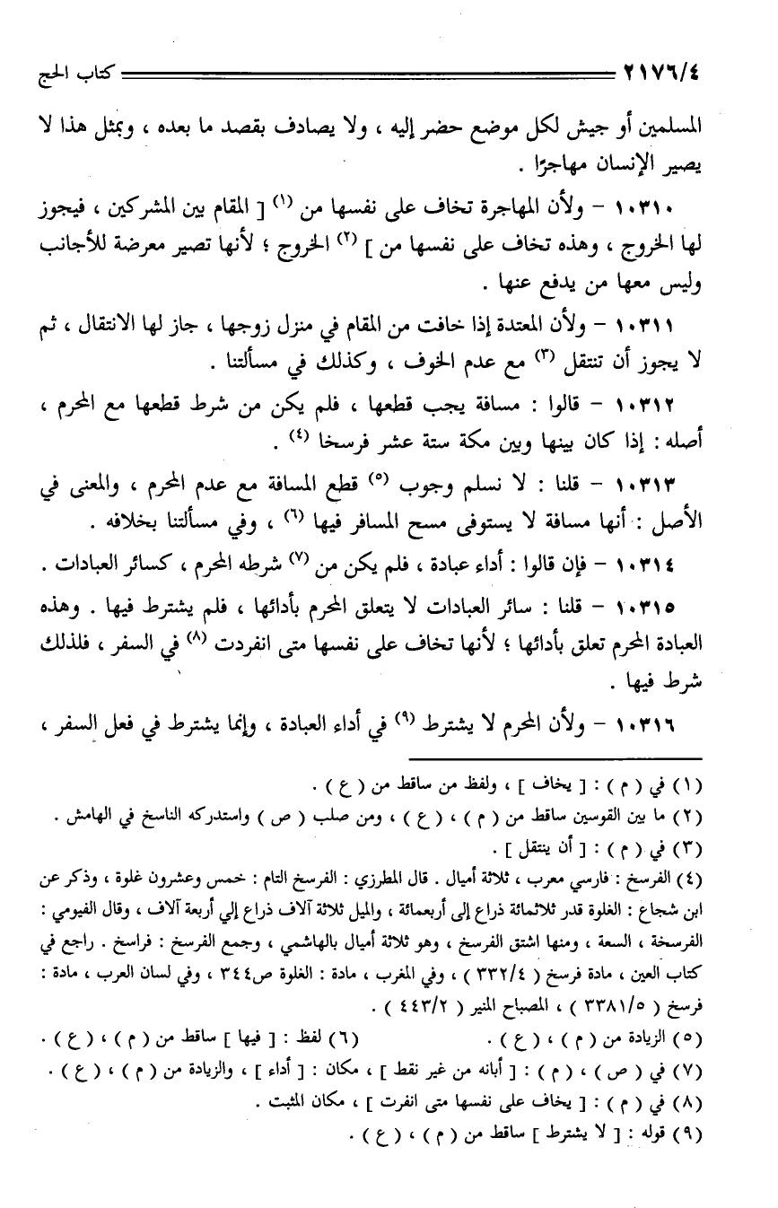 10313 - قلنا: لا نسلم وجوب قطع المسافة مع عدم المحرم، والمعنى في الأصل: أنها مسافة لا يستوفى مسح المسافر فيها، وفي مسألتنا بخلافه.