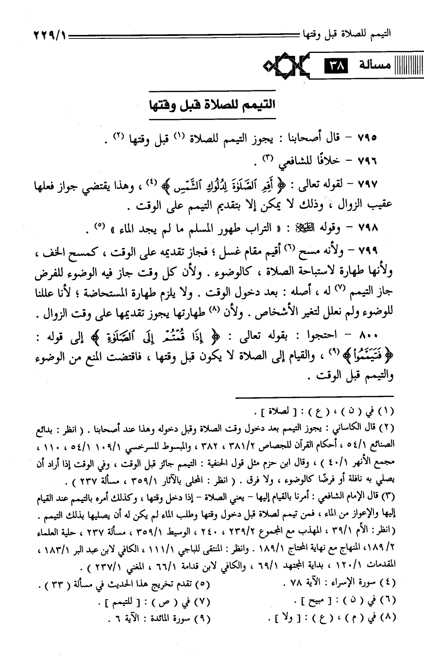 800 - احتجوا: بقوله تعالى: {إذا قمتم إلى الصلاة} إلى قوله: {فتيمموا}، والقيام إلى الصلاة لا يكون قبل وقتها، فاقتضت المنع من الوضوء والتيمم قبل الوقت.