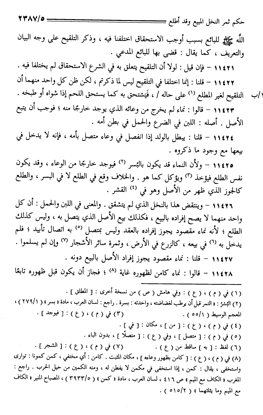 11425 - ولأن النماء قد يكون بالبشر فيوجد خارجًا من الوعاء، وقد يكون نفس الطلع فيؤخذ ويؤكل كما هو. والخلاف وقع في الطلع لا في البسر. والطلع كالجوز الذي ظهر من الأصل وهو في القشر.