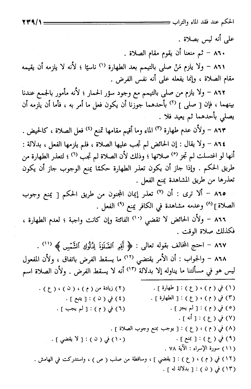 864 - ولا يقال: إن الحائض لم تجب عليها الصلاة، فلم يلزمها الفعل، بدلالة: أنها لو اغتسلت لم تجز صلاتها؛ وذلك لأن الصلاة لم تجب؛ لتعذر الطهارة من طريق الحكم. وإذا جاز أن يكون تعذر الطهارة حكمًا يمنع الوجوب جاز أن يكون تعذرها من طريق المشاهدة يمنع الفعل.