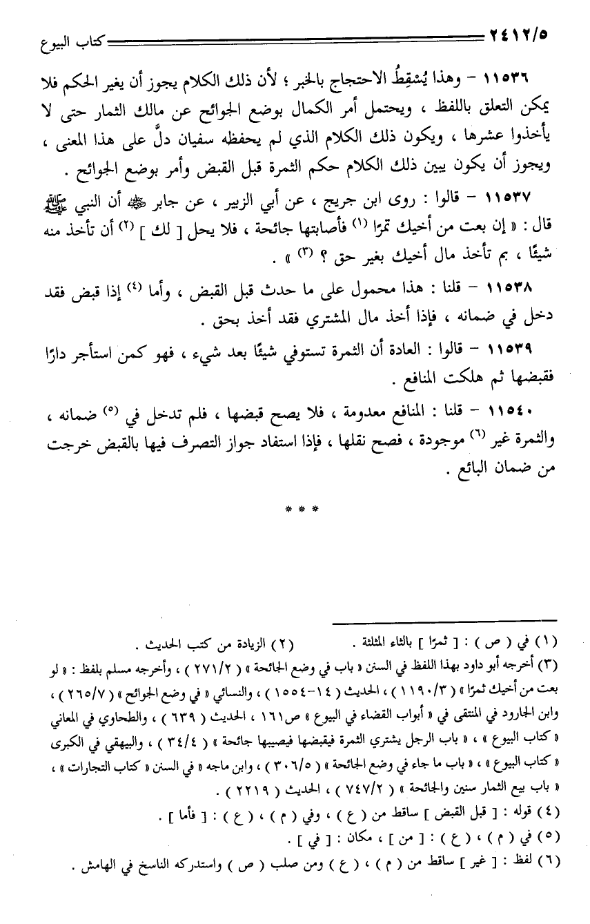 11536 - وهذا يسقط الاحتجاج بالخبر؛ لأن ذلك الكلام يجوز أن يغير الحكم فلا يمكن التلعق باللفظ، ويحتمل أمر الكمال بوضع الجوائح عن مالك الثمار حتى لا يأخذوا عشرها، ويكون ذلك الكلام الذي لم يحفظه سفيان دل على هذا المعنى، ويجوز أن يكون يبين ذلك الكلام حكم الثمرة قبل القبض وأمر بوضع الجوائح.