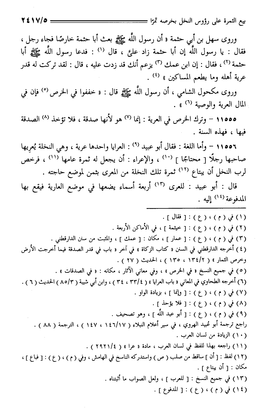 وروى سهل بن أبي حثمة) أن رسول الله - صلى الله عليه وسلم - بعث أبا حثمة خارصًا فجاء رجل، فقال: يا رسول الله إن أبا حثمة زاد على، قال: فدعا رسول الله - صلى الله عليه وسلم - أبا حثمة، فقال: إن ابن عمك يزعم أنك قد زدت عليه، قال: لقد تركت له قدر عرية أهله وما يطعم المساكين).
