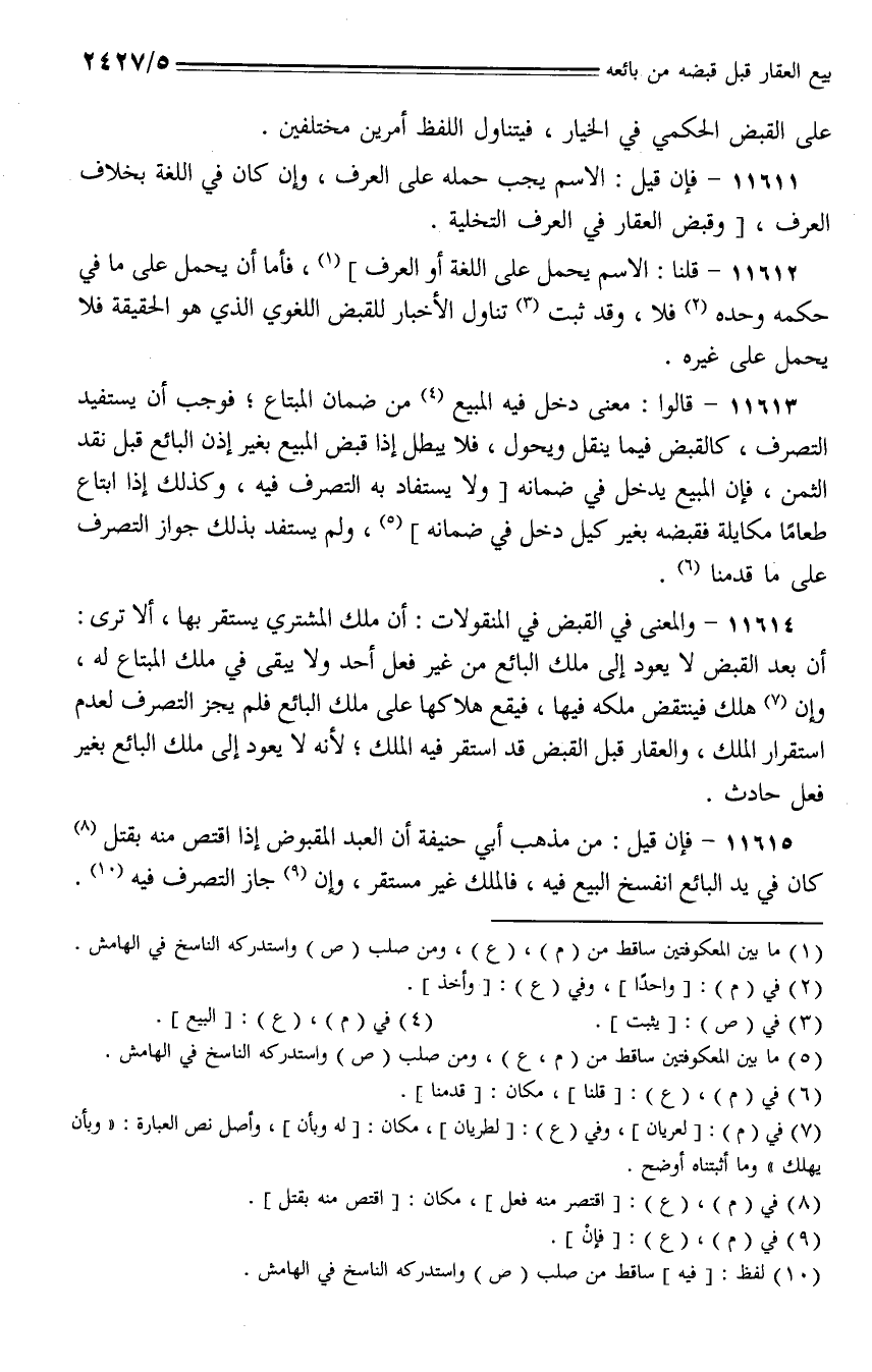 11614 - والمعنى في القبض في المنقولات: أن ملك المشتري يستقر بها، ألا ترى: أن بعد القبض لا يعود إلى ملك البائع من غير فعل أحد ولا يبقى في ملك المبتاع له، وإن هلك فينتفض ملكه فيها، فيقع هلاكها على ملك البائع فلم يجز التصرف لعدم استقرار الملك، والعقار قبل القبض قد استقر فيه الملك، لأنه لا يعود إلى ملك البائع بغير فعل حادث.