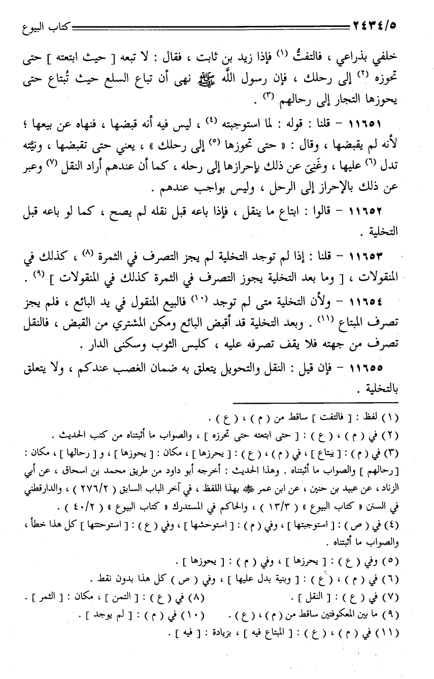11651 - قلنا: قوله: لما استوجبته، ليس فيه أنه قبضها، فنهاه عن بيعها؛ لأنه لم يقبضها، وقال: (حتى تحوزها إلى رحلك)، يعني حتى تقبضها، ونيته تدل عليها، وغني عن ذلك بإحرازها إلى رحله، كما أن عندهم أراد النقل وعبر عن ذلك بالإحراز إلى الرحل، وليس بواجب عندهم.
