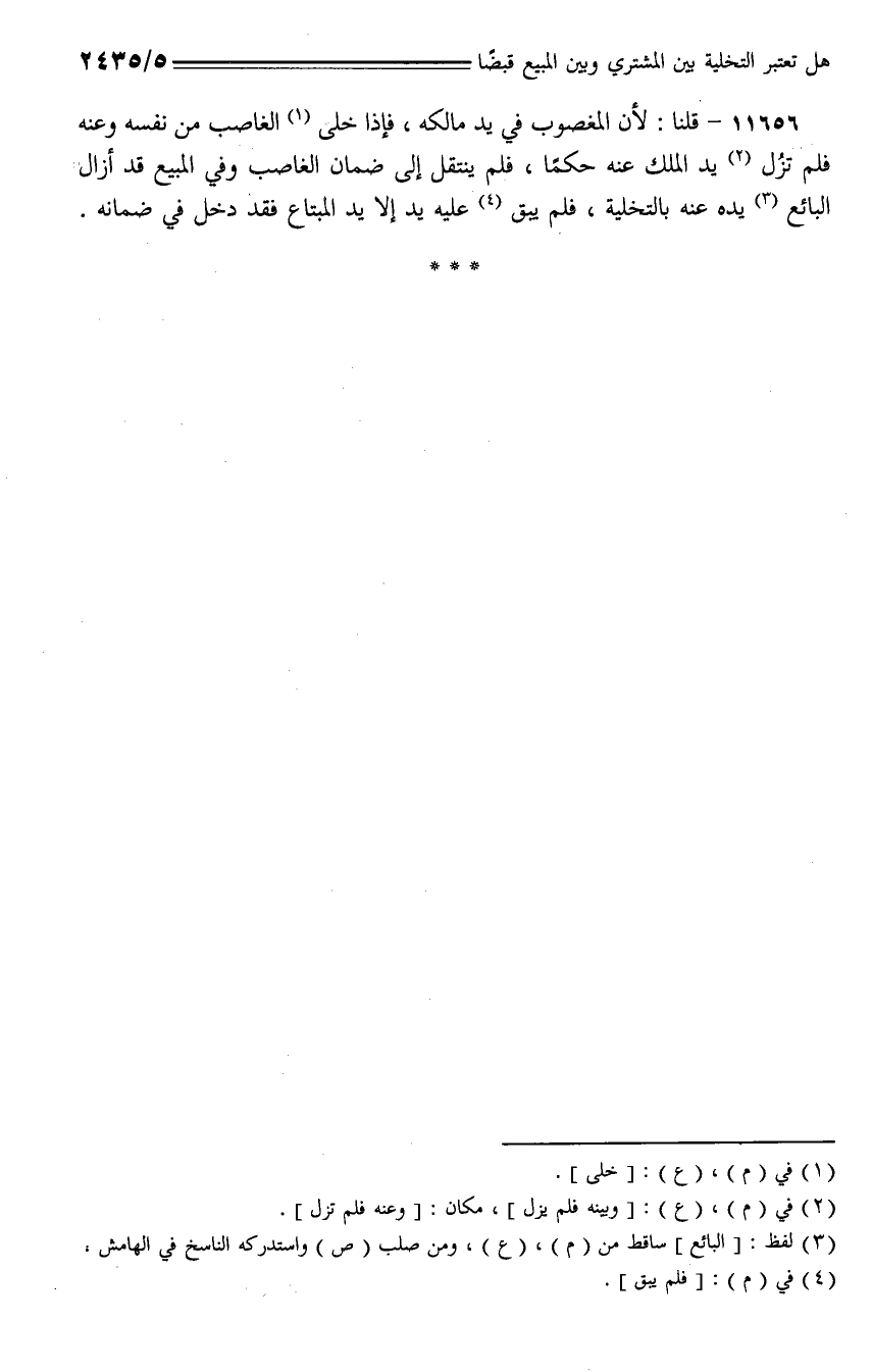 11656 - قلنا: لأن المغصوب في يد مالكه، فإذا خلى الغاصب من نفسه وعنه فلم تزل يد الملك عنه حكماً، فلم ينتقل إلى ضمان الغاصب وفي المبيع قد أزال البائع يده عنه بالتخلية، فلم يبق عليه يد إلا يد المبتاع فقد دخل في ضمانه.