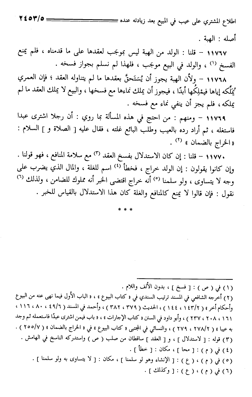 11770 - قلنا: إن كان الاستدلال بفسخ العقد مع سلامة المنافع، فهو قولنا. وإن كانوا يقولون: إن الولد خراج، فخطأ اسم للغلة، والمال الذي يضرب على وجه لا يتساوى، ولو سلمنا أنه خراج اقتضى الخبر أنه مملوك للضامن، ولذلك نقول: فإن قالوا لا يمنع كالمنافع والغلة كان هذا الاستدلال بالقياس للخبر.
