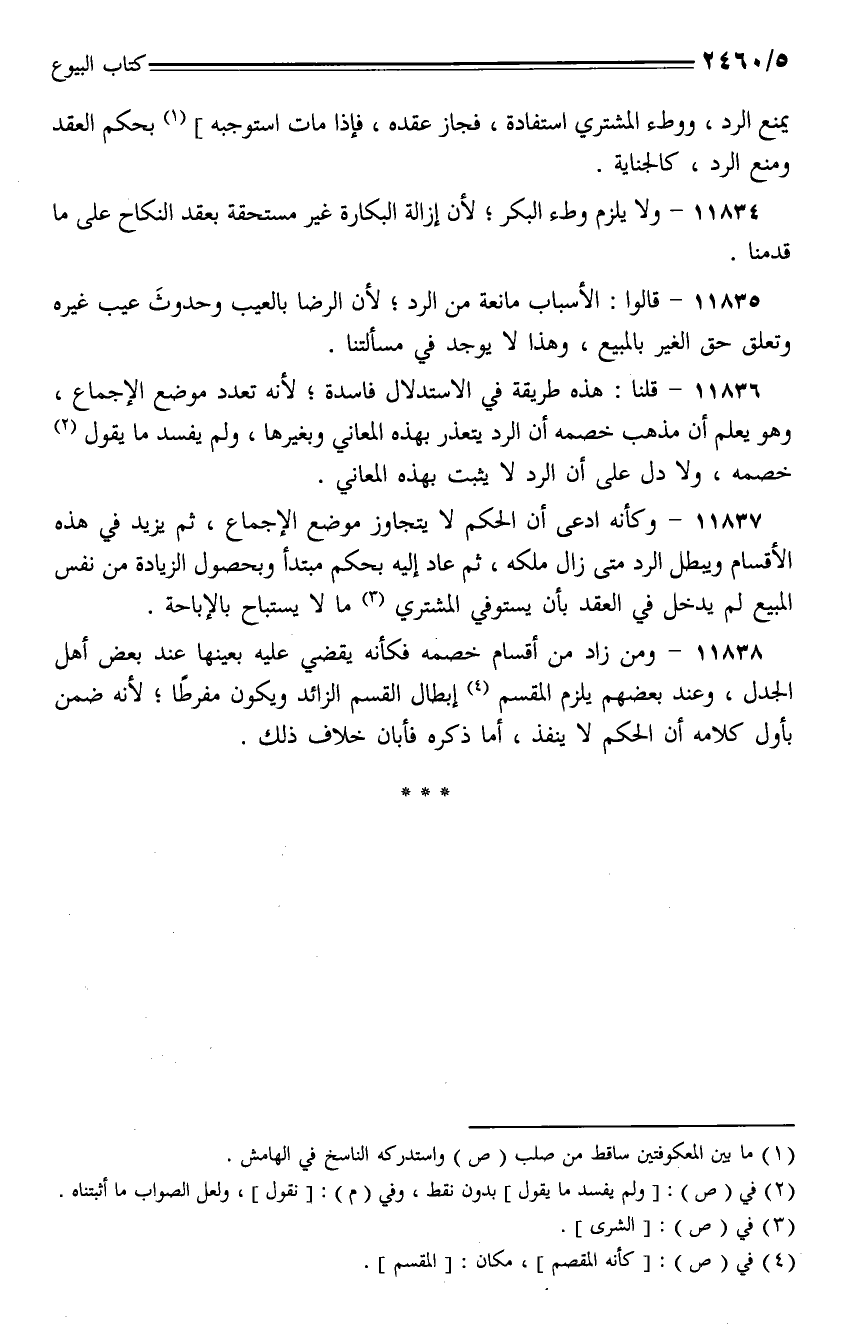 11837 - وكأنه ادعى أن الحكم لا يتجاوز موضع الإجماع، ثم يزيد في هذه الأقسام ويبطل الرد متى زال ملكه، ثم عاد إليه بحكم مبتدأ وبحصول الزيادة من نفس المبيع لم يدخل في العقد بأن يستوفي المشتري ما لا يستباح بالإباحة.