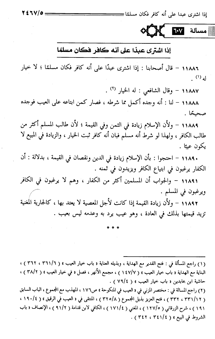 11889 - ولن الإسلام زيادة في الثمن وفي القيمة؛ لأن طالب المسلم أكثر من طالب الكافر، ولهذا لو شرط أنه مسلم فبان أنه كافر ثبت الخيار، والزيادة في المبيع لا يكون عيباً.