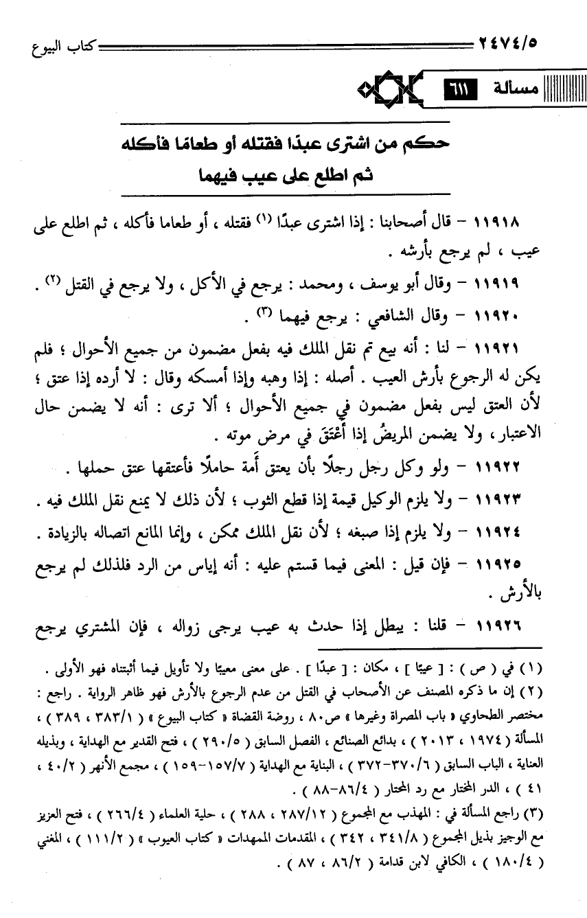 11918 - قال أصحابنا: إذا اشترى عبداً فقتله، أو طعاماً فأكله، ثم اطلع على عيب، لم يرجع بأرشه.