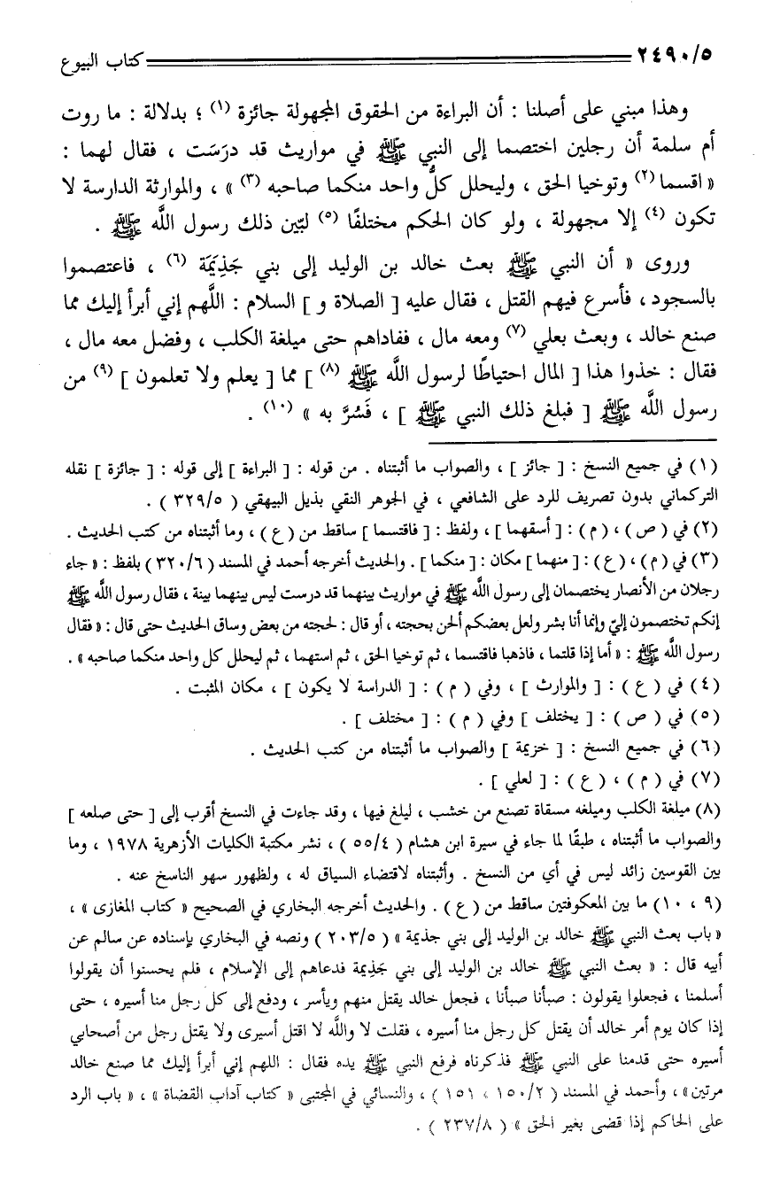 وروي (أن النبي - صلى الله عليه وسلم - بعث خالد بن الوليد إلى بني جذيمة، فاعتصموا بالسجود، فأسرع فيهم القتل، فقال عليه [الصلاة و] السلام: اللهم إني أبرأ إليك مما صنع خالد، وبعث بعلي ومعه مال، ففاداهم حتى ميلغة الكلب، وفضل معه مال، فقال: خذوا هذا [المال احتياطاً لرسول الله - صلى الله عليه وسلم -] مما [يعلم ولا تعلمون] من رسول الله - صلى الله عليه وسلم -[فبلغ ذلك النبي - صلى الله عليه وسلم -]، فسُرَّ به).
