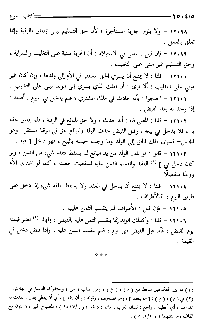 12102 - قلنا: المعنى فيه: أنه حدث، ولا حق للبائع في الرقبة، فلم يتعلق حقه به، فلا يدخل في بيعه، وقبل القبض حدث الولد وللبائع حق في الرقبة مستقر- وهو الجنس- فسرى ذلك الحق إلى الولد وما وجب حبسه بالبيع، فهو داخل [فيه.