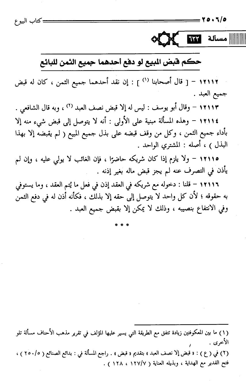 12114 - وهذه المسألة مبنية على الأولى: أنه لا يتوصل إلى قبض شيء منه إلا بأداء جميع الثمن، وكل من وقف قبضه على بذل جميع المبيع (لم يقبضه إلا بهذا البذل)، أصله: المشتري الواحد.