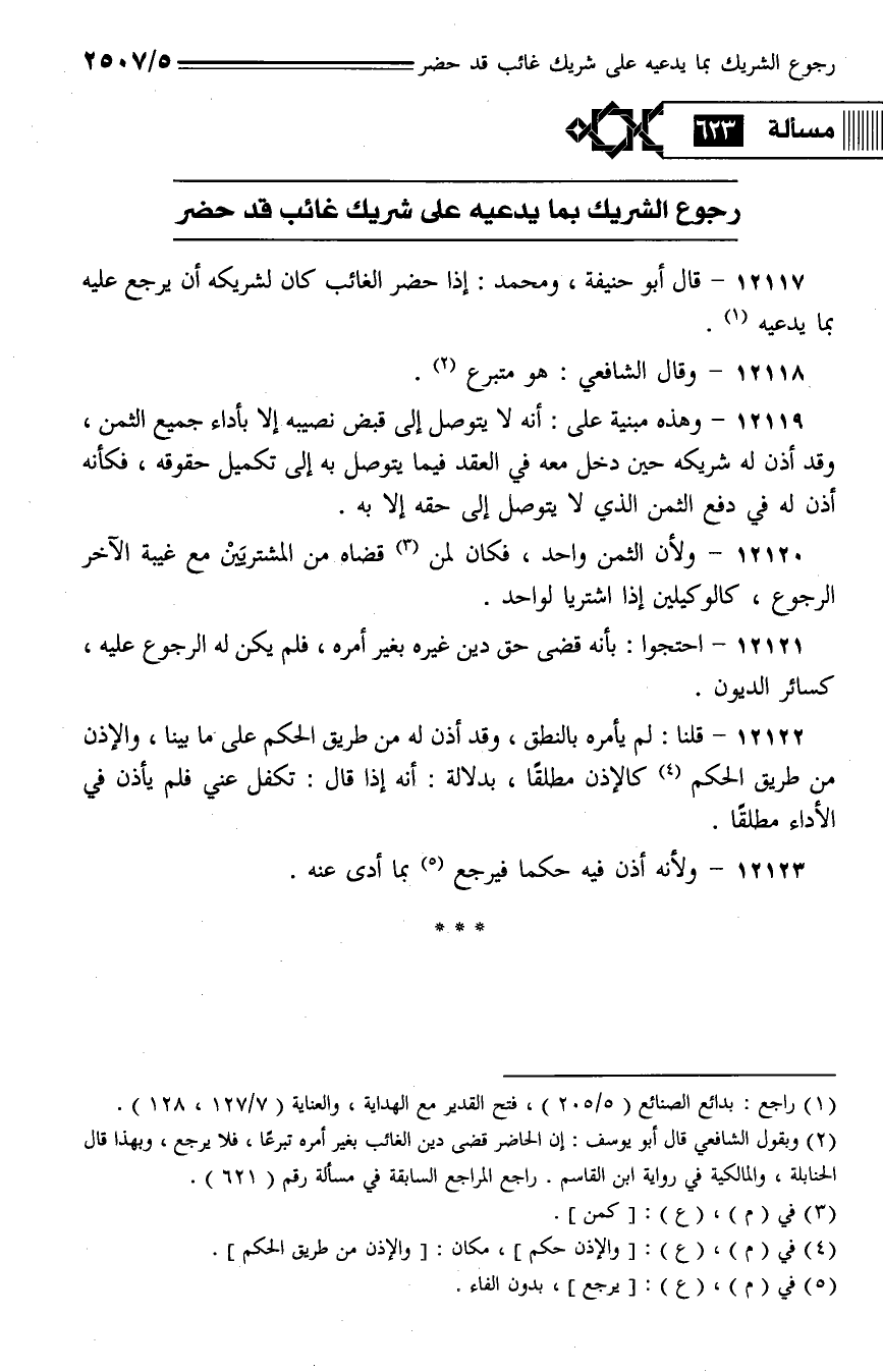 12117 - قال أبو حنيفة، ومحمد: إذا حضر الغائب كان لشريكه أن يرجع عليه بما يدعيه.