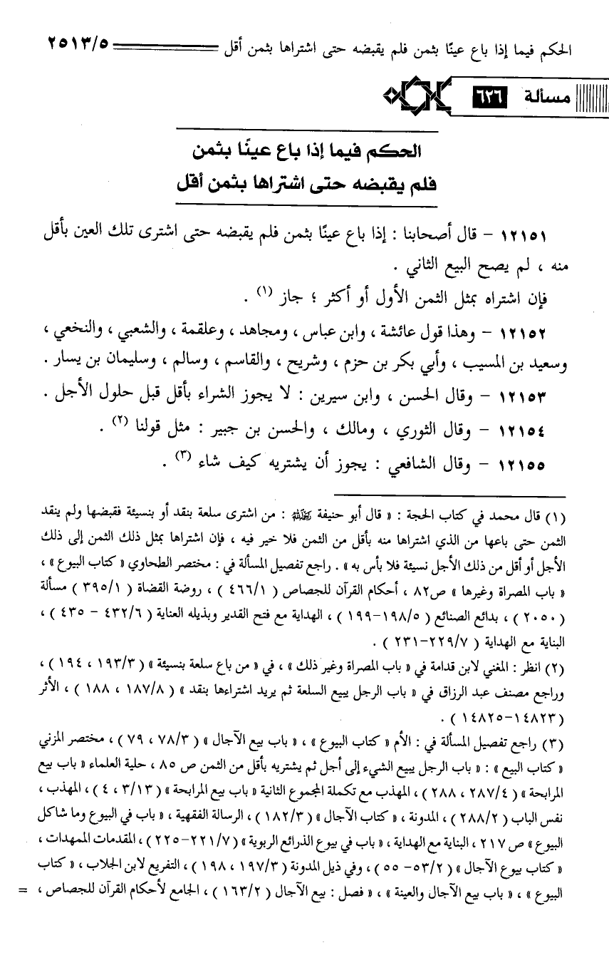 12151 - قال أصحابنا: إذا باع عيناً بثمن فلم يقبضه حتى اشترى تلك العين بأقل منهن لم يصح البيع الثاني.