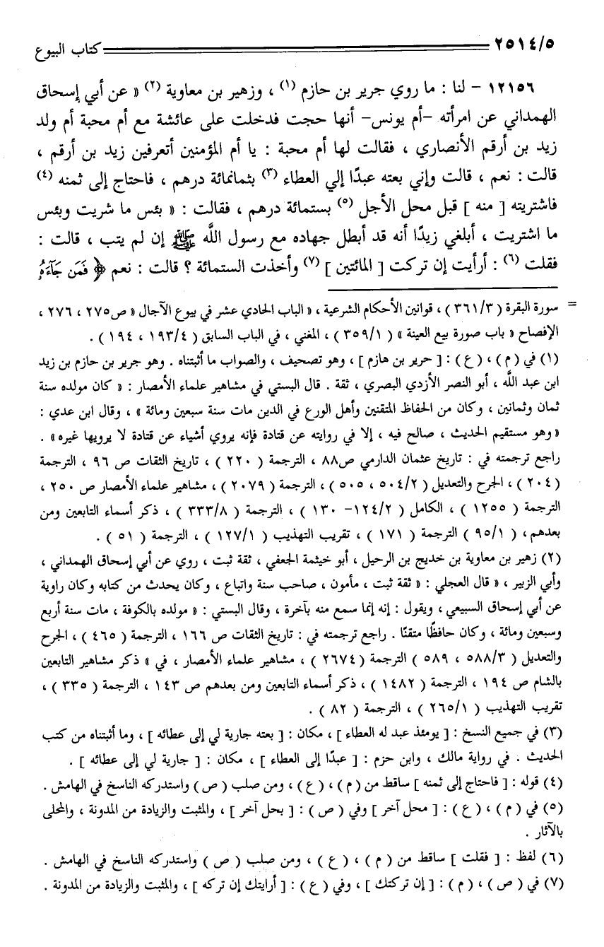 12156 - لنا: ما روى جرير بن حازم، وزهير بن معاوية (عن أبي إسحاق الهمداني عن امرأته- أم يونس- أنها حجت فدخلت على عائشة مع أم محبة أم ولد زيد بن أرقم الأنصاري، فقالت لها أم محبة: يا أم المؤمنين أتعرفين زيد بن أرقم، قالت: نعم، قالت وإني بعته عبداً إلي العطاء بثمانمائة درهم، فاحتاج إلى ثمنه فاشتريته [منه] قبل محل الجل بستمائة درهم، فقالت: (بئس ما شريت وبشس ما اشتريت، أبلغي زيداً أنه قد أبطل جهاده مع رسول الله - صلى الله عليه وسلم - إن لم يتبن قالت: فقلت: أرأيت إن تركت [المائتين] وأخذت الستمائة؟ قالت: نعم {فمن جاءه