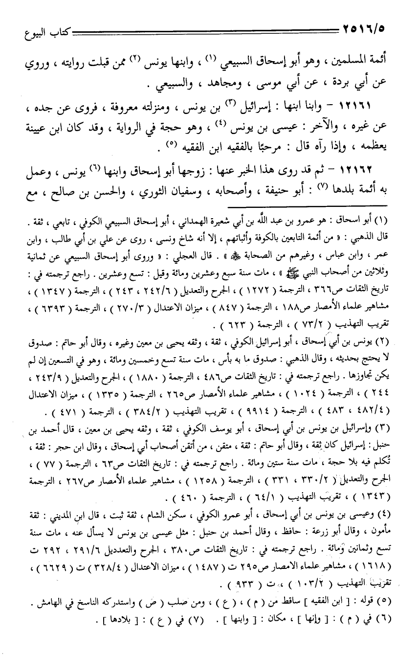 12162 - ثم قد روى هذا الخبر عنها: زوجها أبو إسحاق وابنها يونس، وعمل به أئمة بلدها: أبو حنيفة، وأصحابه، وسفيان الثوري، والحسن بن صالح، مع