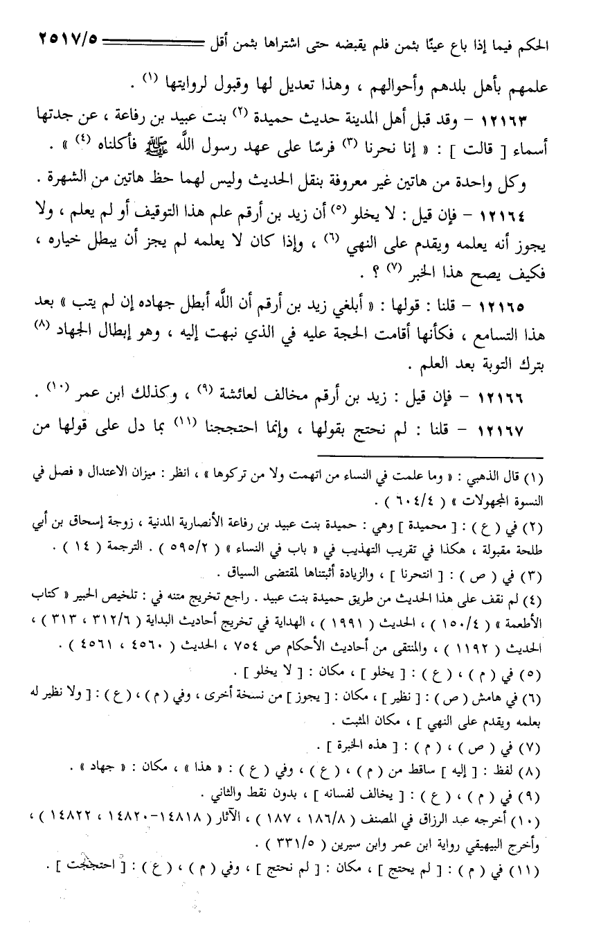 12164 - فإن قيل: لا يخلو أن زيد بن أرقم علم هذا التوقيف أو لم يعلم، ولا يجوز أنه يعلمه ويقدم على النهي، وإذا كان لا يعلمه لم يجز أن يبطل خياره، فكيف يصح هذا الخبر؟