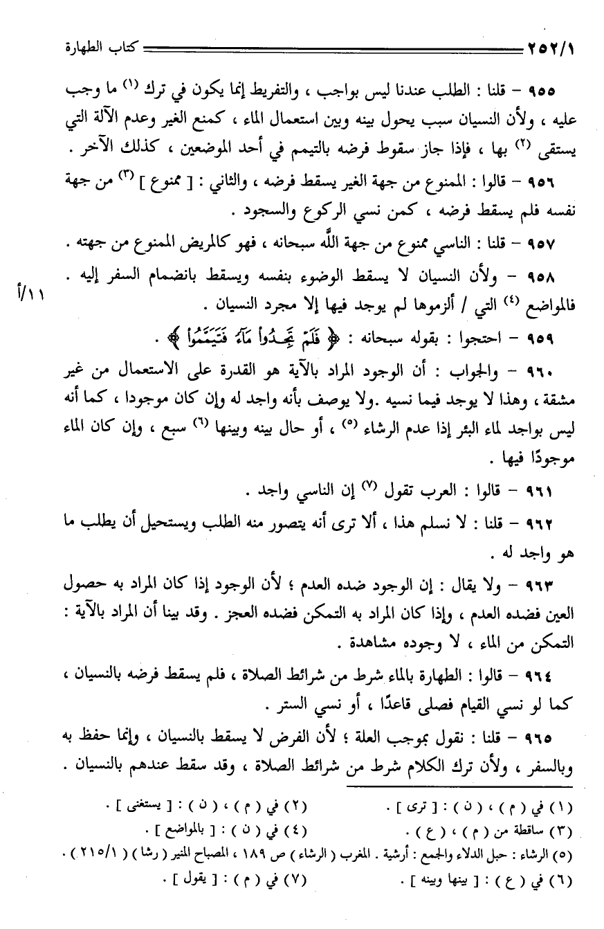 960 - والجواب: أن الوجود المراد بالآية هو القدرة على الاستعمال من غير مشقة، وهذا لا يوجد فيما نسيه. ولا يوصف بأنه واجد له وإن كان موجودا، كما أنه ليس بواجد لماء البئر إذا عدم الرشاء، أو حال بينه وبينها سبع، وإن كان الماء موجودًا فيها.