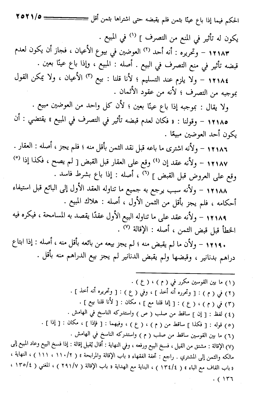 12188 - ولأنه سبب يرجع به جميع ما تناوله العقد الأول إلى البائع قبل استيفاء أحكامه، فلم يجز بأقل من الثمن الأول، أصله: هلاك المبيع.