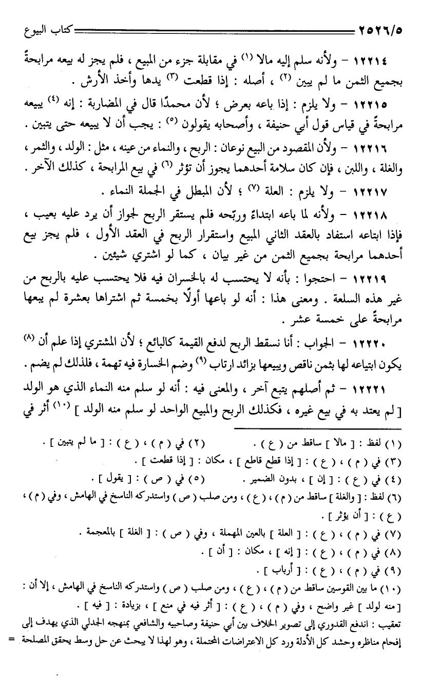 12221 - ثم أصلهم يتبع آخر، والمعنى فيه: أنه لو سلم منه النماء الذي هو الولد [لم يعتد به في بيع غيره، فكذلك الربح والمبيع الواحد لو سلم منه الولد] أثر في