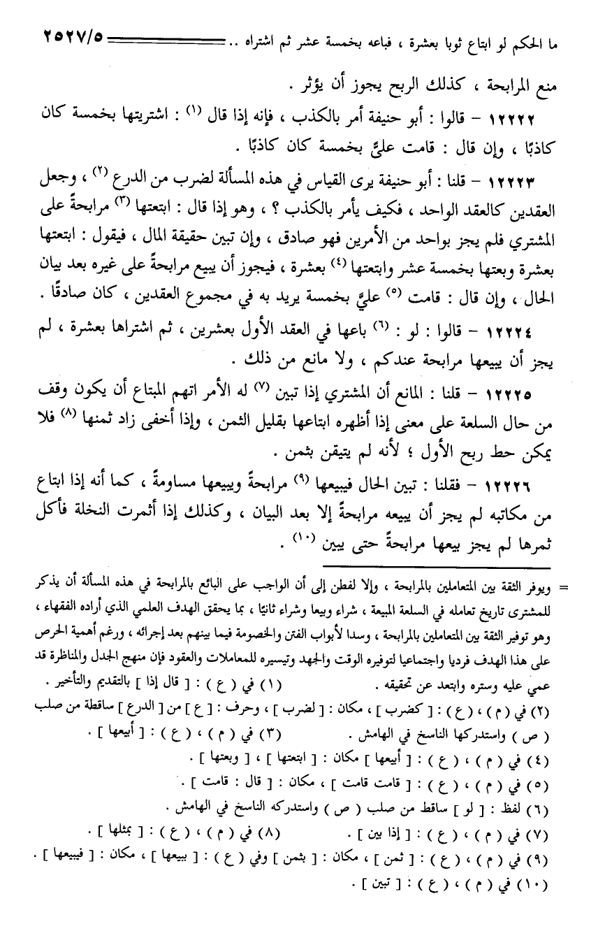 12224 - قالوا: لو: باعها في العقد الأول بعشرين، ثم اشتراها بعشرة، لم يجز أن يبيعها مرابحة عندكم، ولا مانع من ذلك.