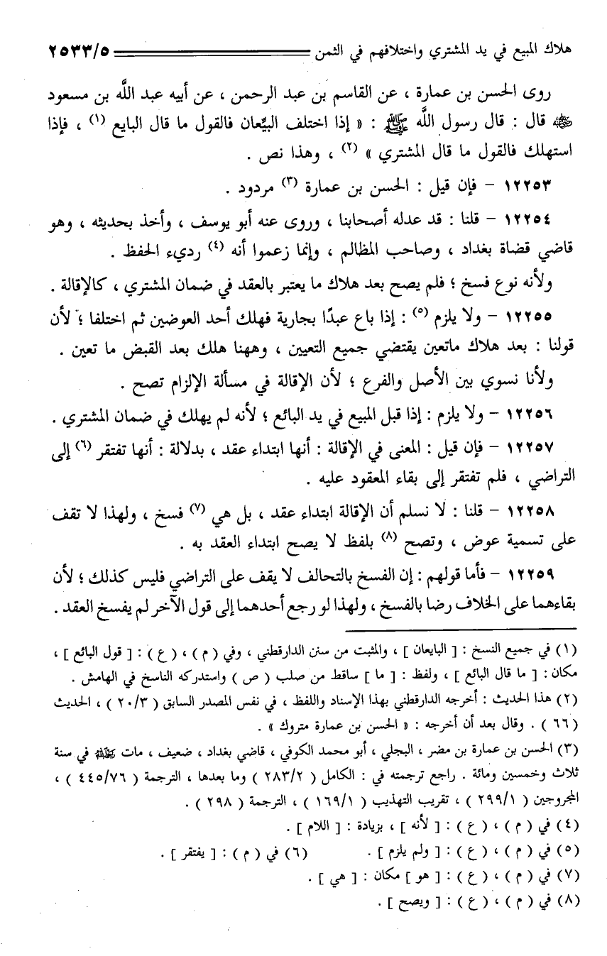 12255 - ولا يلزم: إذا باع عبداً بجارية فهلك أحد العوضين ثم اختلفا؛ لأن قولنا: بعد هلاك ما تعين يقتضي جميع التعيين، وها هنا هلك بعد القبض ما تعين.