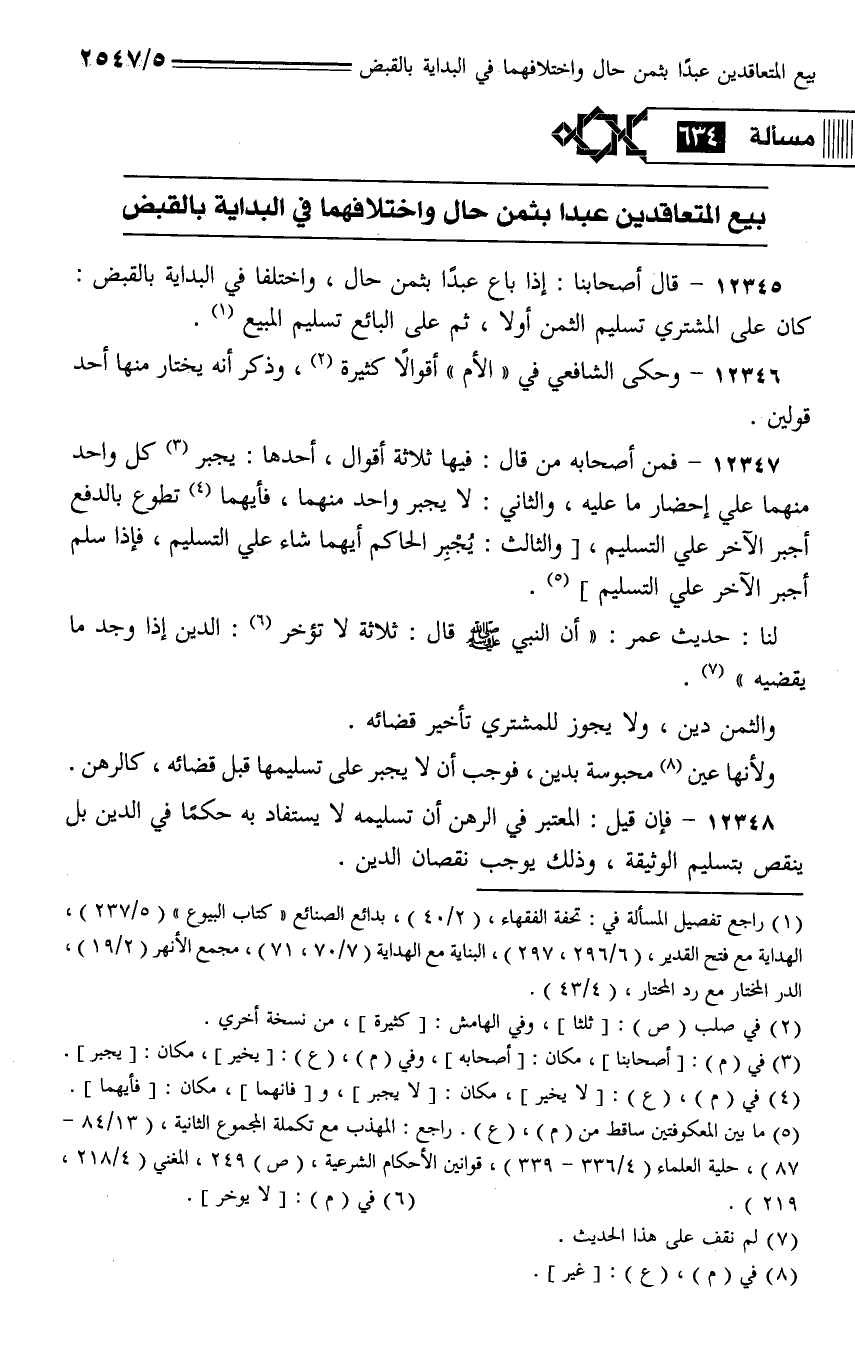 12345 - قال أصحابنا: إذا باع عبداً بثمن حال، واختلفا في البداية بالقبض: كان على المشتري تسليم الثمن أولاً، ثم على البائع تسليم المبيع.