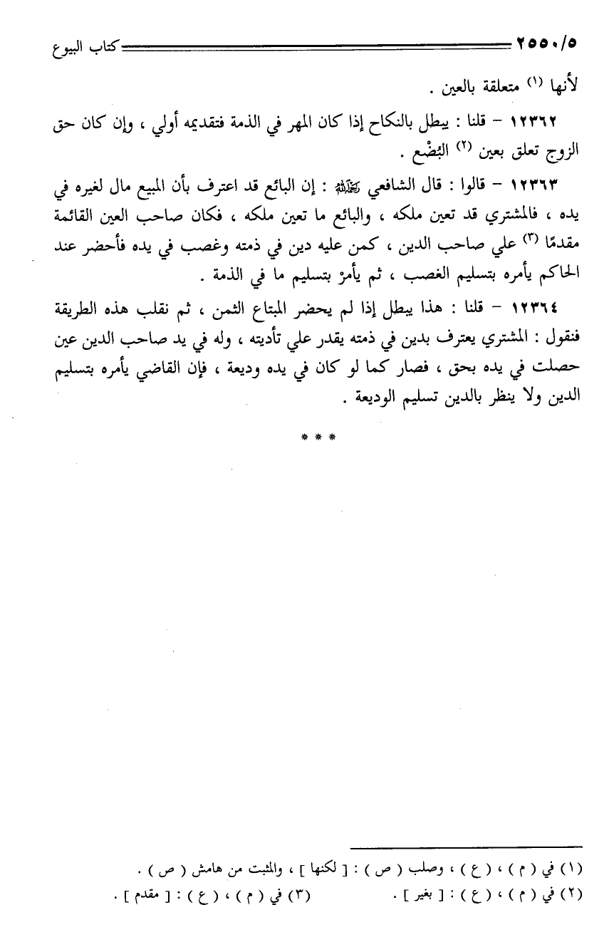 12363 - قالوا: قال الشافعي رحمه الله: إن البائع قد اعترف بأن المبيع مال لغيره في يده، فالمشتري قد تعين ملكه، والبائع ما تعين ملكه، فكان صاحب العين القائمة مقدماً على صاحب الدين، كمن عليه دين في ذمته وغصب في يده فأحضر عند الحاكم يأمره بتسليم الغصب، ثم يأمر بتسليم ما في الذمة.
