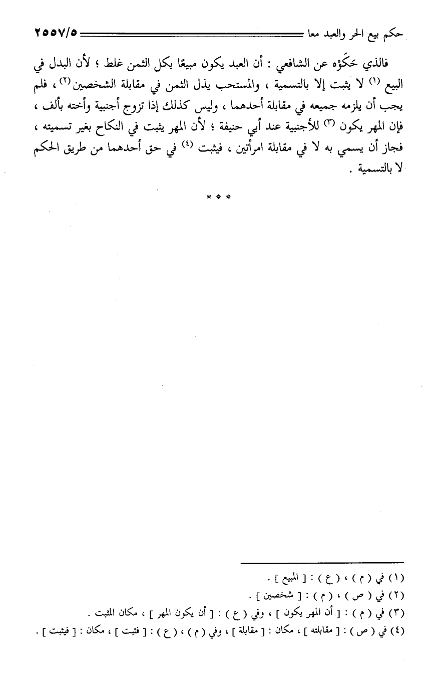 فالذي حكوه عن الشافعي: أن العبد يكون مبيعاً بكل الثمن غلط؛ لأن البدل في البيع لا يثبت إلا بالتسمية، والمستحب بذل الثمن في مقابلة الشخصين، فلم يجب أن يلزمه جميعه في مقابلة أحدهما، وليس كذلك إذا تزوج أجنبية وأخته بألف، فإن المهر يكون للأجنبية عند أبي حنيفة؛ لأن المهر يثبت في النكاح بغير تسميته، فجاز أن يسمي به في مقابلة امرأتين، فيثبت في حق أحدهما من طريق الحكم لا بالتسمية.