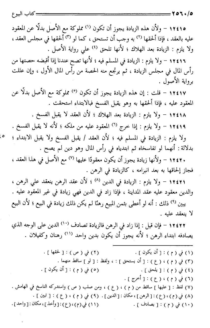 12416 - ولا يلزم: الزيادة في المسلم فيه؛ لأنها تصح عندنا إذا أقبضه حصتها من رأس المال في مجلس الزيادة، ثم يرتجع منه الحصة من رأس المال الأول، وإن عللت برواية الأصول.