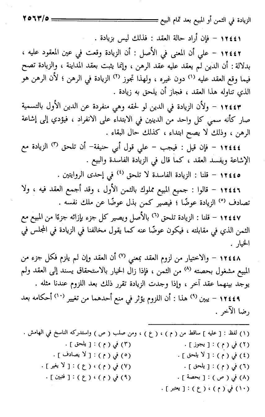12446 - قالوا: جميع المبيع مملوك بالثمن الأول، وقد أجمع العقد فيه، ولا تصادف الزيادة عوضاً؛ فيصير كمن بذل عوضاً عن ملك نفسه.