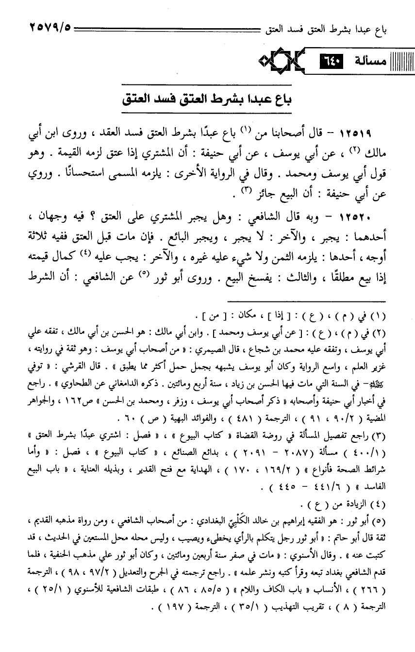 12519 - قال أصحابنا من باع عبدًا بشرط العتق فسد العقد، وروى ابن أبي مالك، عن أبي يوسف، عن أبي حنيفة: أن المشتري إذا عتق لزمه القيمة. وهو قول أبي يوسف ومحمد. وقال في الرواية الأخرى: يلزمه المسمى استحسانًا. وروي عن أبي حنيفة: أن البيع جائز.