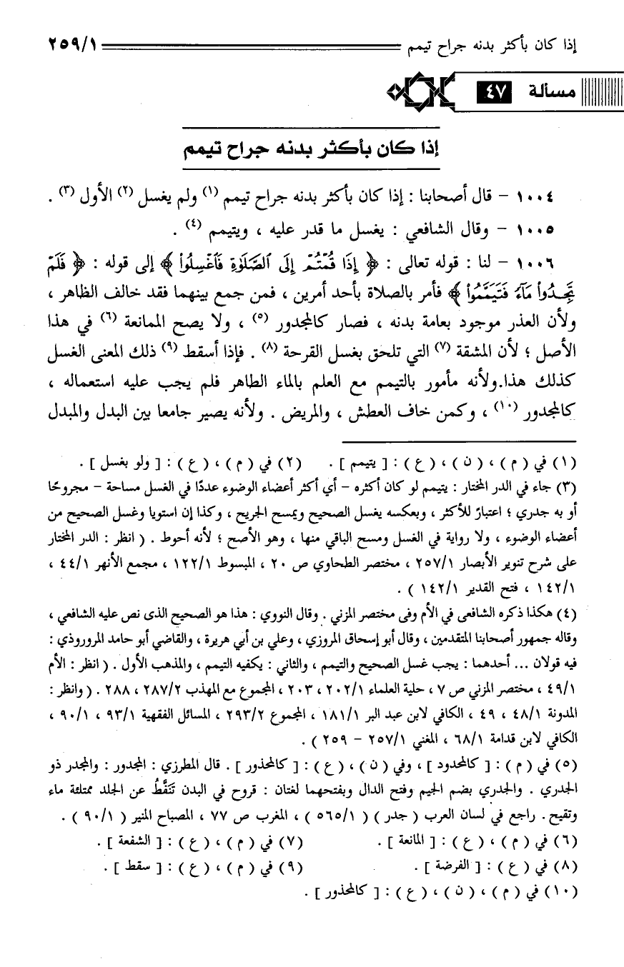 1004 - قال أصحابنا: إذا كان بأكثر بدنه جراح تيمم ولم يغسل الأول.