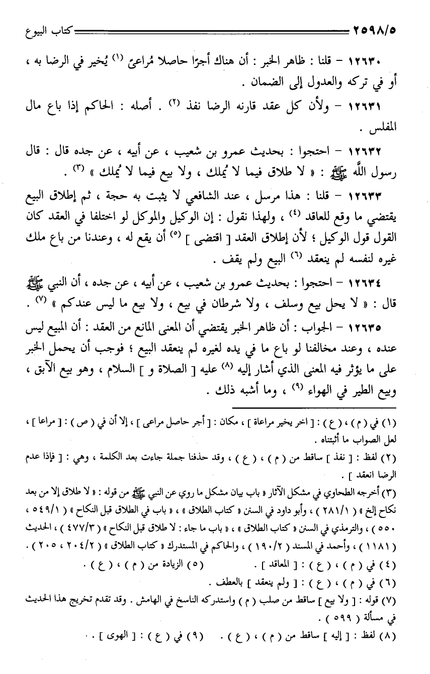 12634 - احتجوا: بحديث عمرو بن شعيب، عن أبيه، عن جده، أن النبي - صلى الله عليه وسلم - قال: (لا يحل بيع وسلف، ولا شرطان في بيع، ولا بيع ما ليس عندكم).
