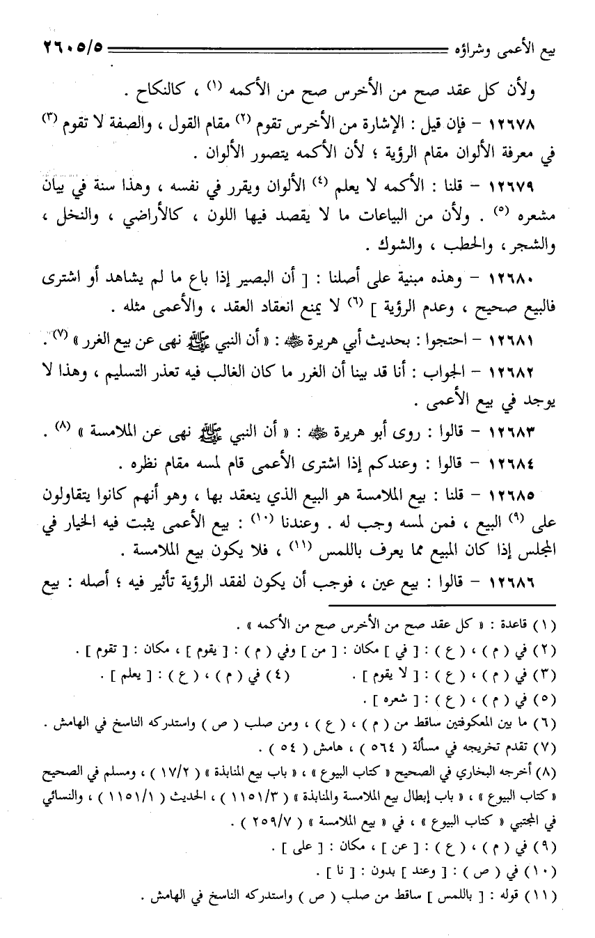 12679 - قلنا: الأكمه لا يعلم الألوان ويقرر في نفسه، وهذا سنة في بيان مشعره. ولأن من البياعات ما لا يقصد فيها اللون، كالأراضي، والنخل، والشجر، والحطب، والشوك.