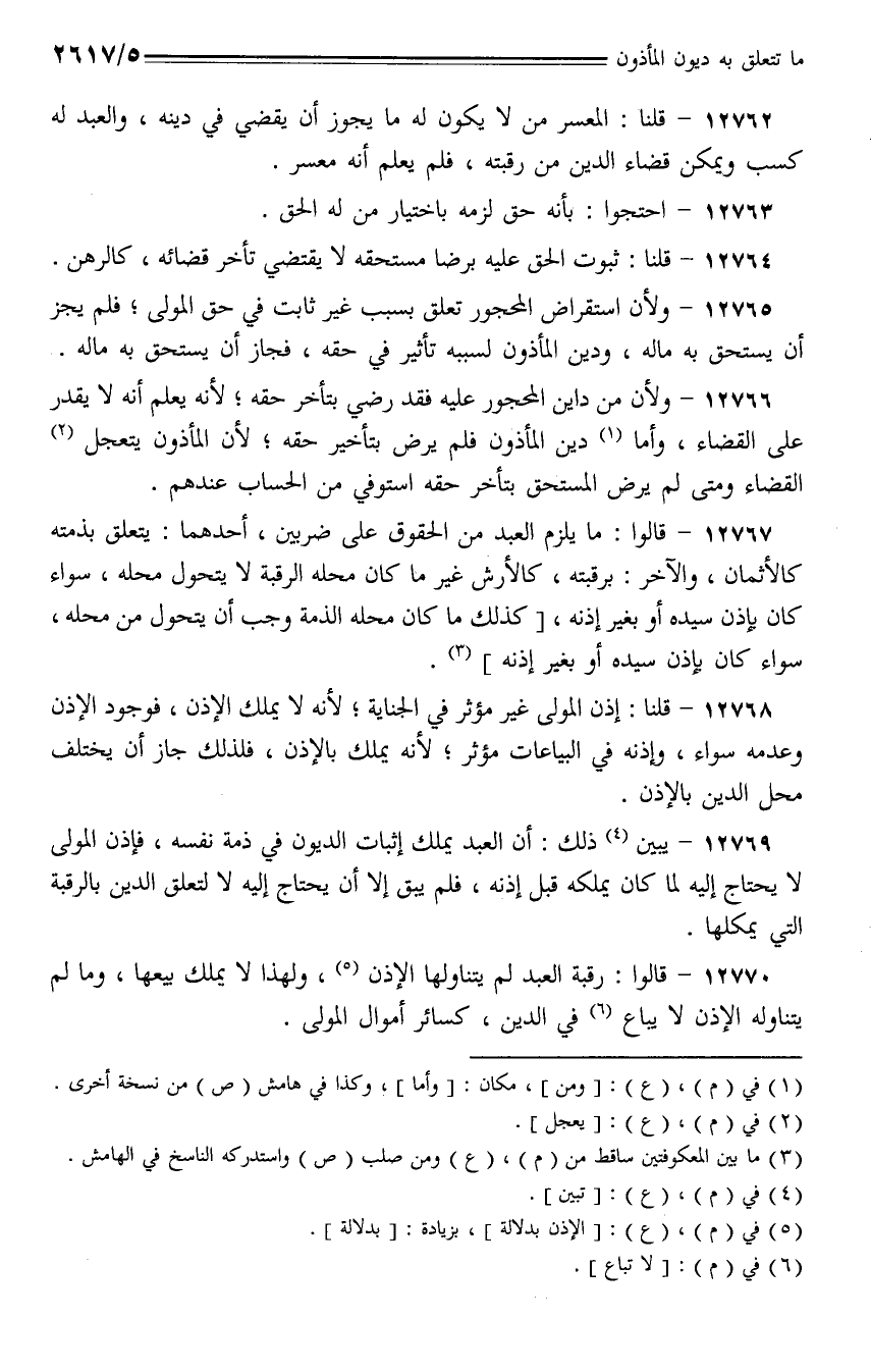 12767 - قالوا: ما يلزم العب دمن الحقوق على ضربين، أحدهما: يتعلق بذمته كالأثمان، والآخر: برقبته، كالأرش غير ما كان محله الرقبة لا يتحول محله، سواء كان بإذن سيده أو بغير إذنه، [كذلك ما كان محله الذمة وجب أن يتحول من محله، سواء كان بإذن سيده أو بغير إذنه].