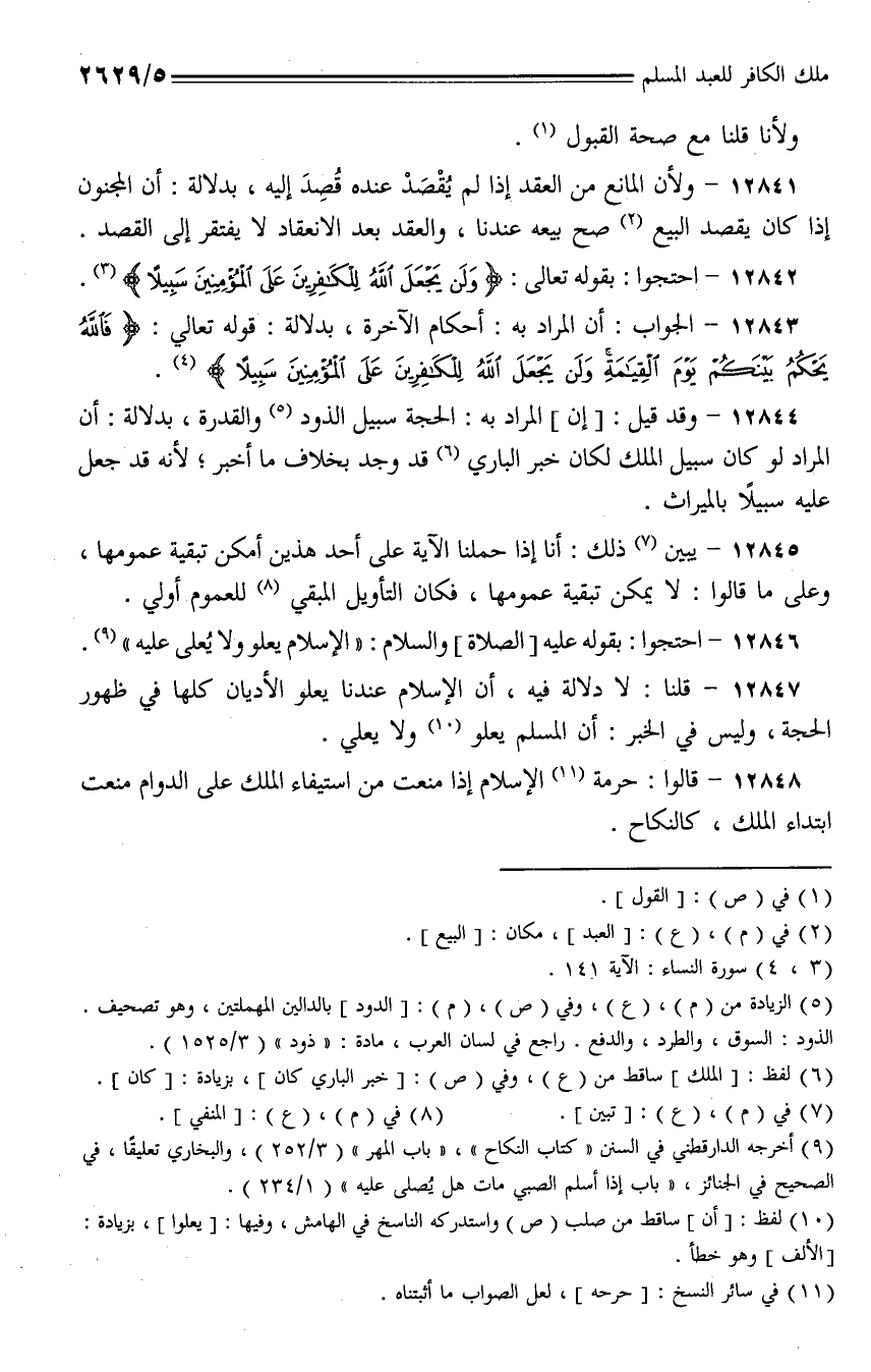 12842 - احتجوا: بقوله تعالى: {ولن يجعل الله للكافرين على المؤمنين سبيلًا}.