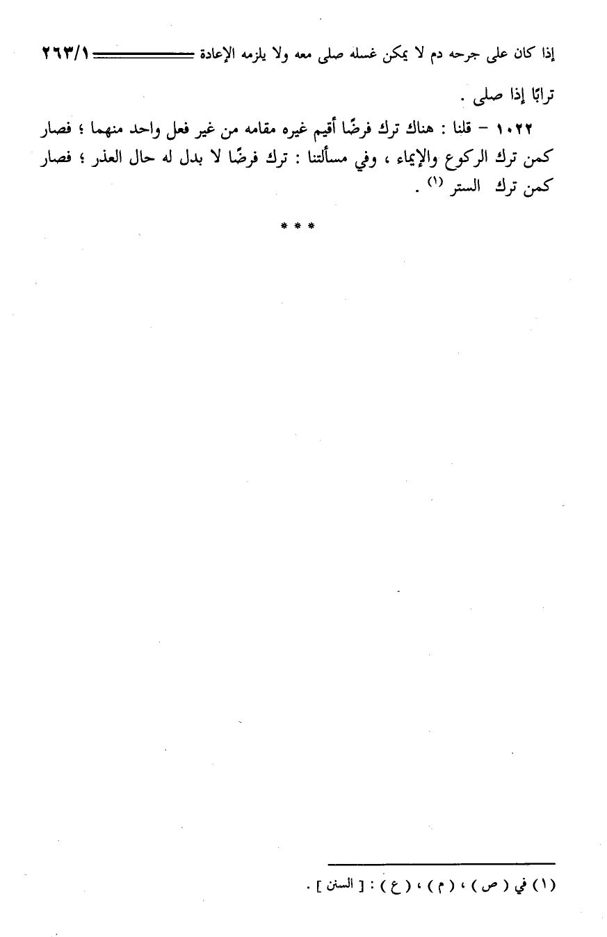 1022 - - قلنا: هناك ترك فرضًا أقيم غيره مقامه من غير فعل واحد منهما؛ فصار كمن ترك الركوع والإيماء، وفي مسألتنا: ترك فرضًا لا بدل له حال العذر؛ فصار كمن ترك الستر.