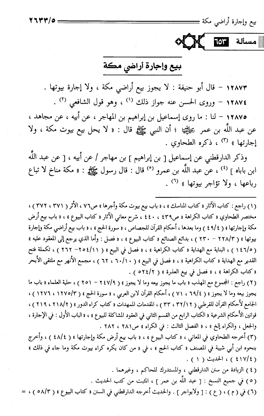 12875 - لنا: ما روى إسماعيل بن إبراهيم بن المهاجر، عن أبيه، عن مجاهد، عن عبد الله بن عمر رضي الله عنهما؛ أن النبي - صلى الله عليه وسلم - قال: (لا يحل بيع بيوت مكة، ولا إجارتها)، ذكره الطحاوي.