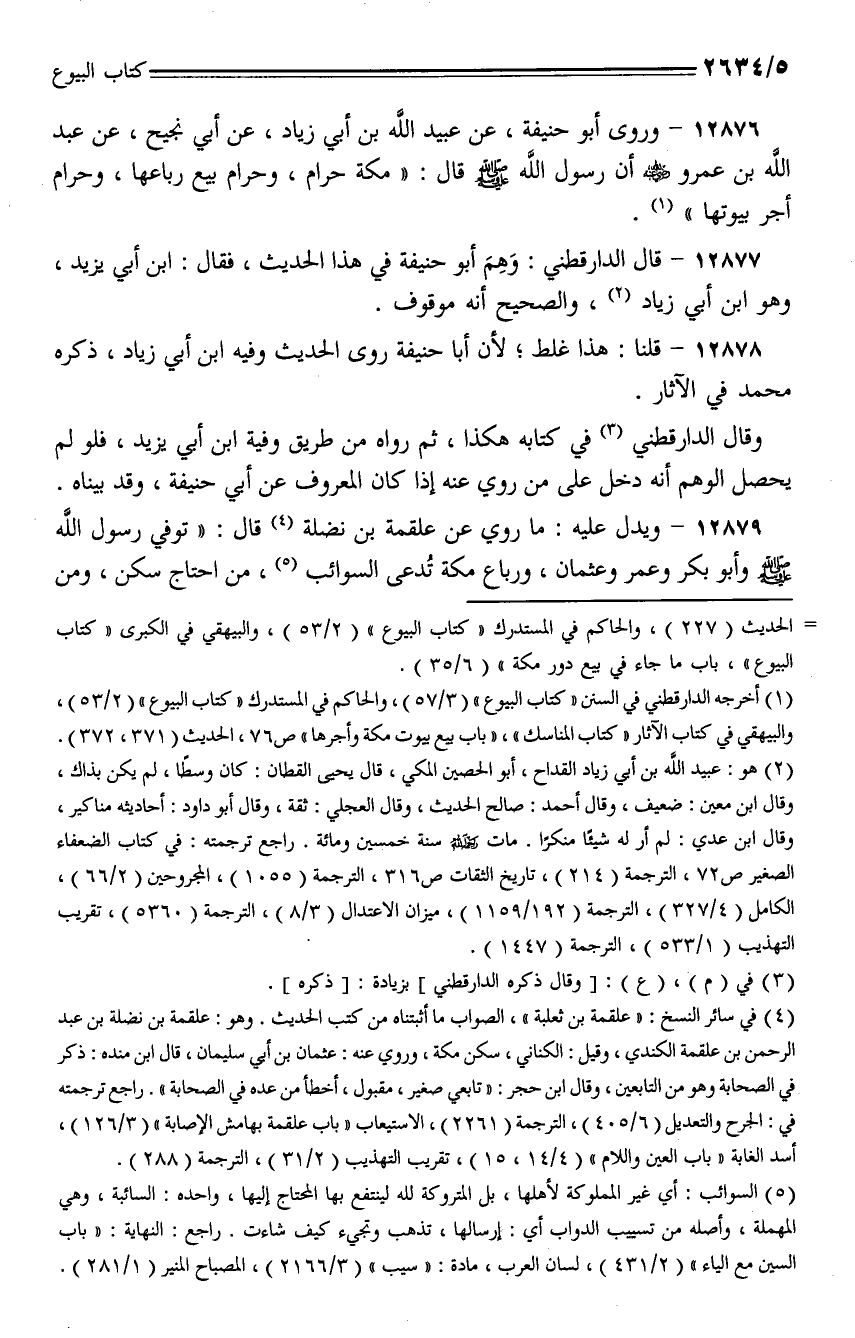 12876 - وروى أبو حنيفة، عن عبيد الله بن أبي زياد، عن أبي نجيح، عن عبد الله بن عمرو - رضي الله عنهم - أن رسول الله - صلى الله عليه وسلم - قال: (مكة حرام، وحرام بيع رباعها، وحرام أجر بيوتها).