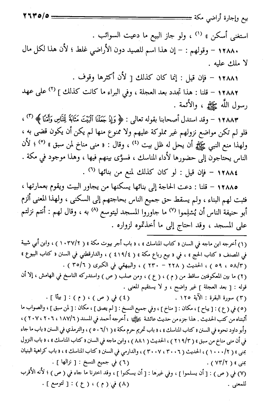 12883 - ولهذا استدل أصحابنا بقوله تعالى: {وإذ جعلنا البيت مثابة للناس وأمنًا}، فلو لم تكن مواضع نزولهم غير مملوكة عليهم ولا ممنوع منها لم يكن أن يكون قضى به، ولهذا منع النبي - صلى الله عليه وسلم - أن يحل له ظل بيت، وقال: (منى مناخ لمن سبق)؛ لأن الناس يحتاجون إلى حضورها لأداء المناسك، فسوى بينهم فيها، وهذا موجود في مكة.