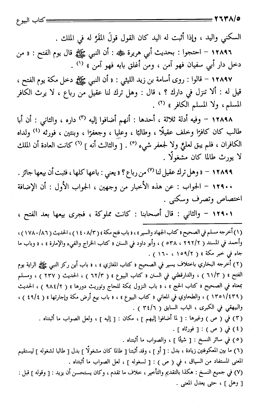 12898 - وفيه أدلة ثلاثة، أحدها: أنهم أضافوا إليه داره، والثاني: أن أبا طالب كان كافرًا وخلف عقيلًا، وطالبًا، وعليًا، وجعفرًا، وبنتين، فورثه ولداه الكافران، فلم يبق لعلي ولا لجعفر شيء. [والثالث أنه] كانت العادة أن الملك لا يورث طالما كان مشغولًا.