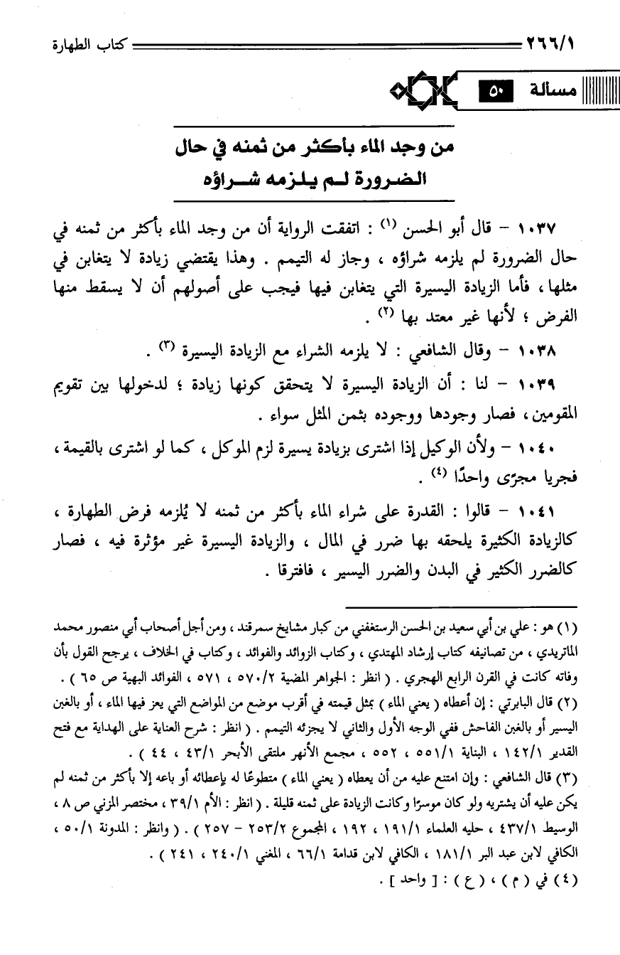 1041 - قالوا: القدرة على شراء الماء بأكثر من ثمنه لا يُلزمه فرض الطهارة، كالزيادة الكثيرة يلحقه بها ضرر في المال، والزيادة اليسيرة غير مؤثرة فيه، فصار كالضرر الكثير في البدن والضرر اليسير، فافترقا.