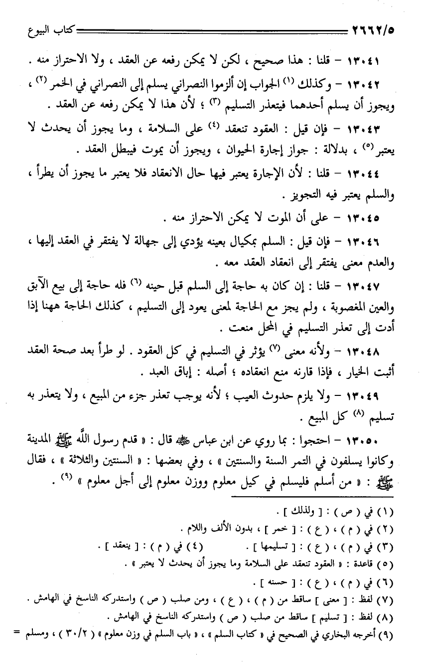 13050 - احتجوا: بما روي عن ابن عباس - رضي الله عنهم - قال: (قدم رسول الله - صلى الله عليه وسلم - المدينة وكانوا يسلفون في التمر السنة والسنتين)، وفي بعضها: (السنتين والثلاثة)، فقال - صلى الله عليه وسلم -: (من أسلم فليسلم في كل معلوم ووزن معلوم إلى أجل معلوم).
