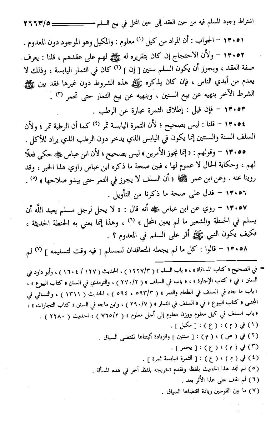 13057 - روي عن ابن عباس - رضي الله عنهم - أنه قال: (لا يحل لرجل مسلم يعبد الله أن يسلم في الحنطة والشعير ما لم يعين المحل)، وهذا إنما يعني به الحنطة الحديثة، فكيف يكون النبي - صلى الله عليه وسلم - أقر على السلم في المعدوم؟.