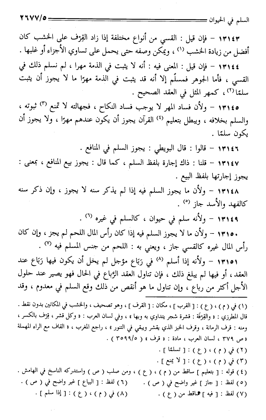 13150 - ولأن ما لا يجوز السلم فيه إذا كان رأس المال اللحم لم يجز، وإن كان رأس المال غيره كالقسي جاز، ويعني به: اللحم من جنس المسلم فيه.