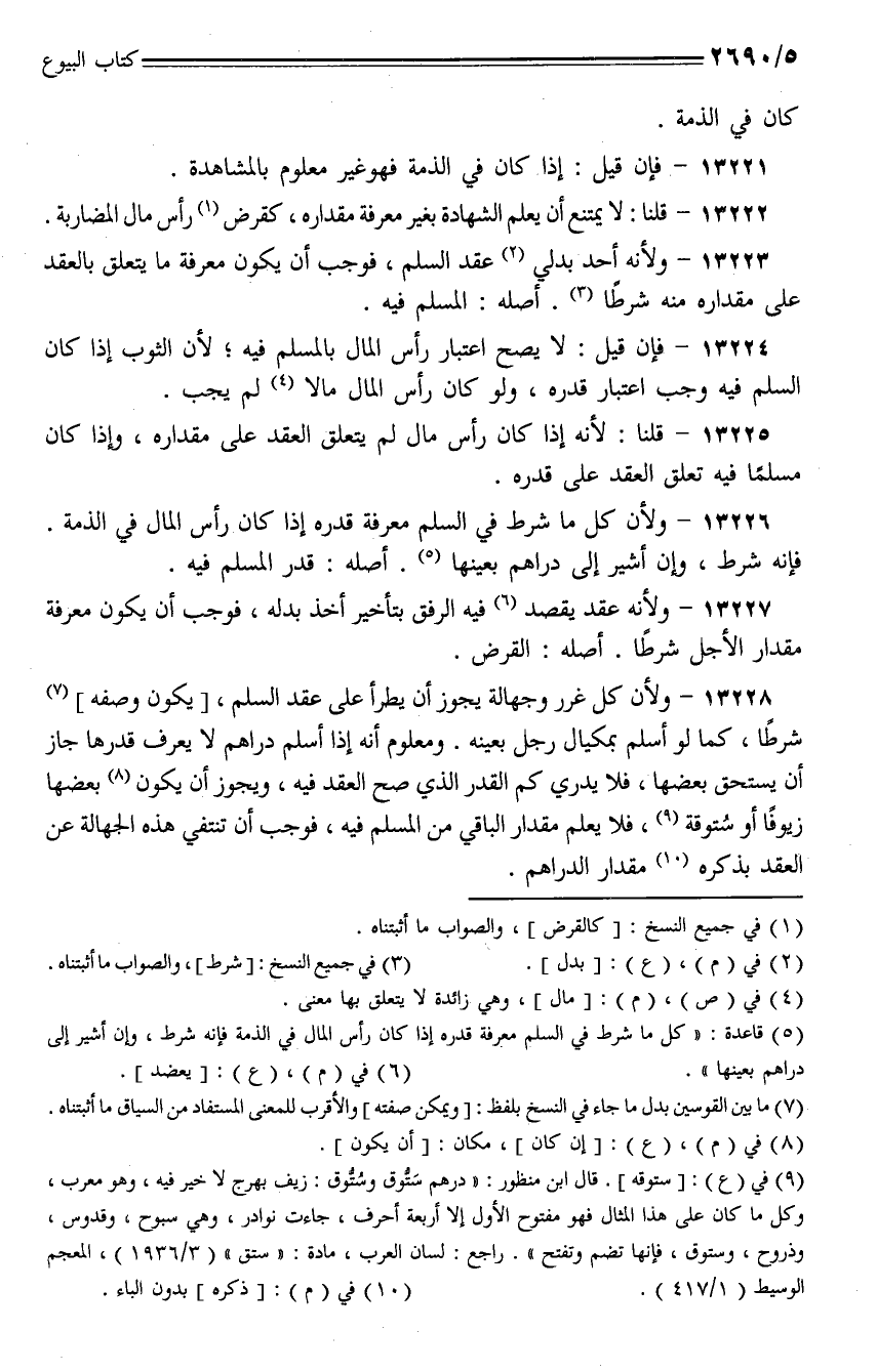 13226 - ولن كل ما شرط في السلم معرفة قدره إذا كان رأس المال في الذمة. فإنه شرط، وإن أشير إلى دراهم بعينها. أصله: قدر المسلم فيه.