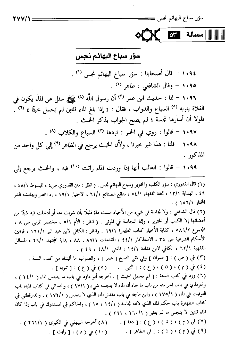 1096 - لنا: حديث ابن عمر أن رسول الله - صلى الله عليه وسلم - سئل عن الماء يكون في الفلاة ينوبه السباع والدواب، فقال: ((إذا بلغ الماء قلتين لم يَحمل خبثًا)). فلولا أن أسآرها نجسة؛ لم يصح الجواب بذكر الخبث.