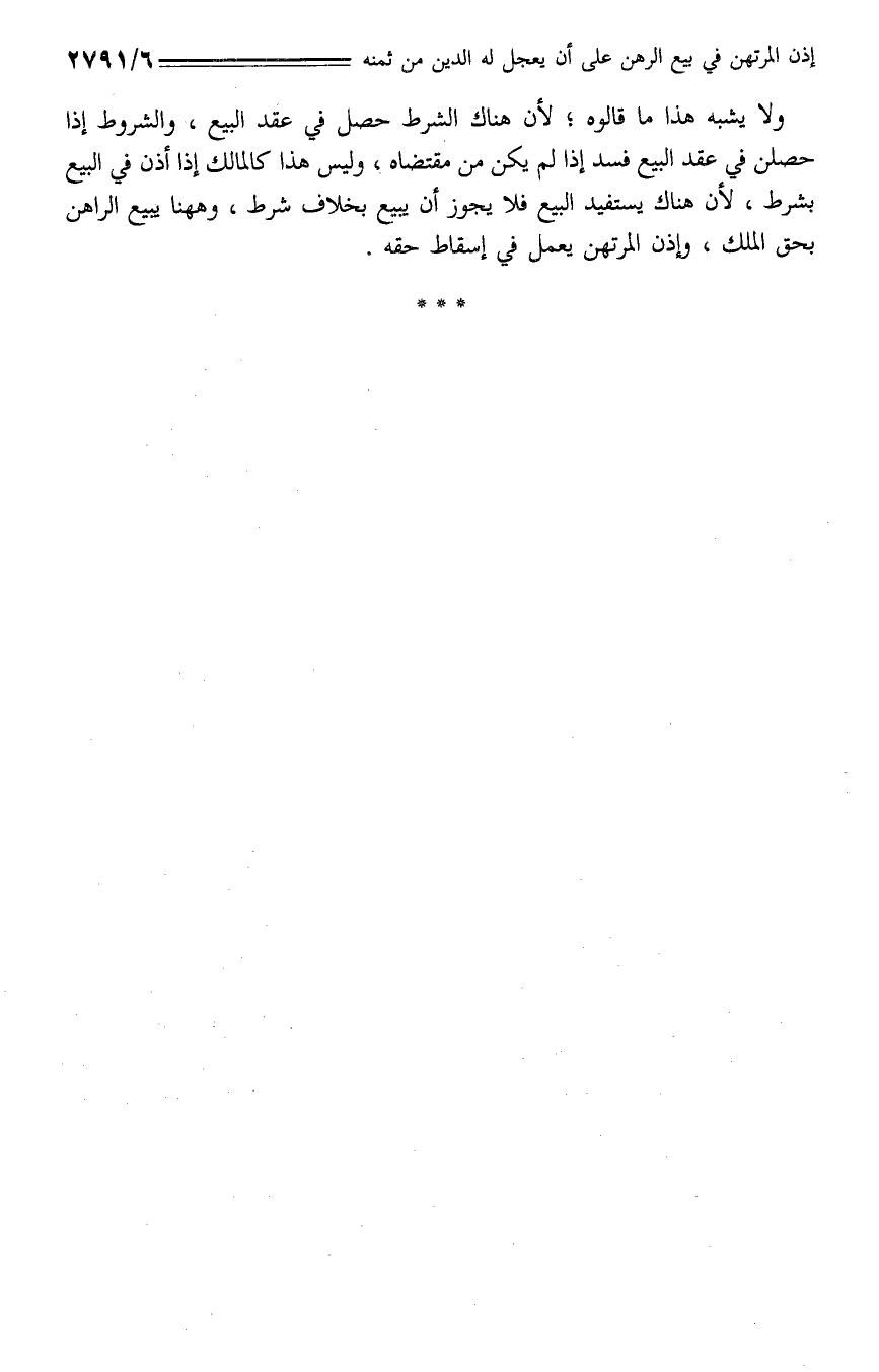 ولا يشبه هذا ما قالوه؛ لأن هناك الشرط حصل في عقد البيع، والشروط إذا حصلن في عقد البيع فسد إذا لم يكن من مقتضاه، وليس هذا كالمالك إذا أذن في البيع بشرط، لأن هناك يستفيد البيع فلا يجوز أن يبيع بخلاف شرط، وههنا يبيع الراهن بحق الملك، وإذن المرتهن يعمل في إسقاط حقه.