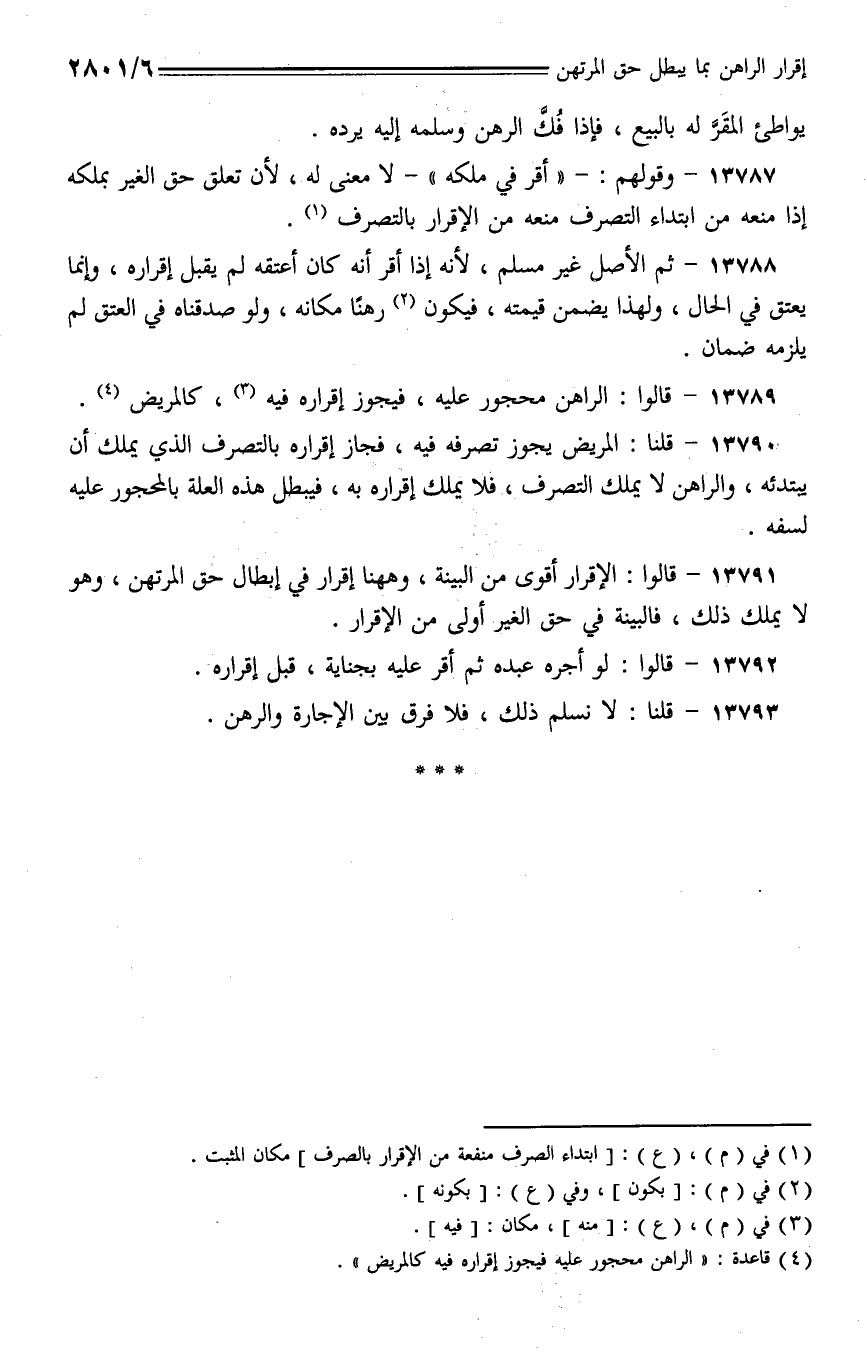 13787 - وقولهم: - (أقر في ملكه) - لا معنى له، لأن تعلق حق الغير بملكه إذا منعه من ابتداء التصرف منعه من الإقرار بالتصرف.